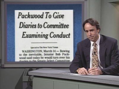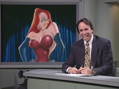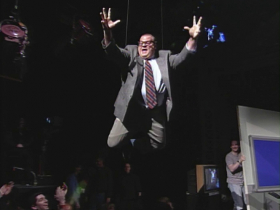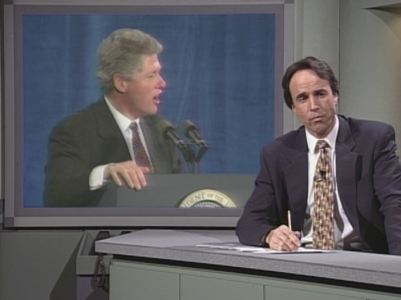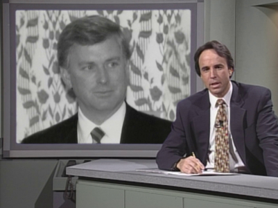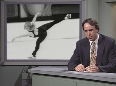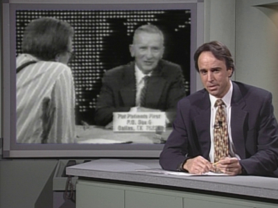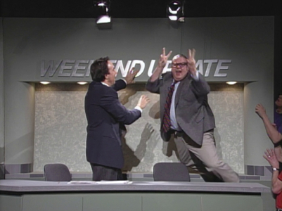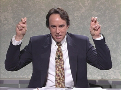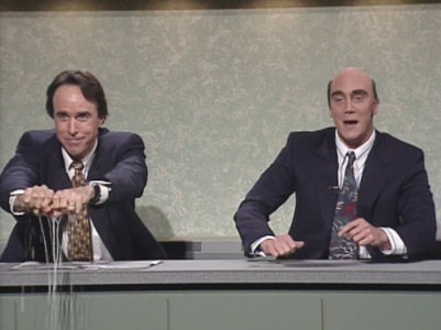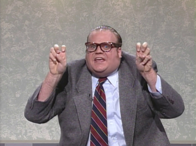 ⁕As Chris Farley is lifted up to fly over the audience, one of the cables gets caught on a spotlight. Kevin Nealon and crew members work to free the cable as Chris ad-libs about his weight problem. After Chris finally soars over the audience and the camera pans back to the desk, Kevin uses air quotes to ad-lib "Maybe the cables didn't clear the light, ladies and gentlemen!"