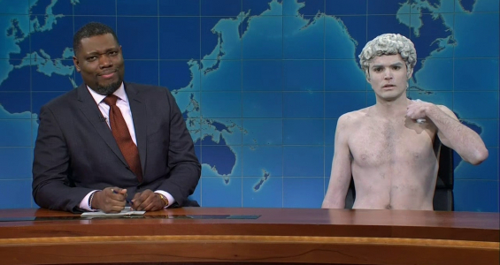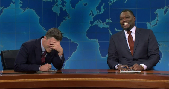 ⁕Colin Jost's first few jokes receive a tepid response from the audience, while Michael Che's receive big laughs and applause. Michael then reveals that he told the audience not to laugh at Colin for April Fools'.