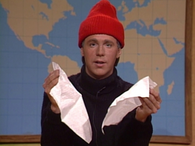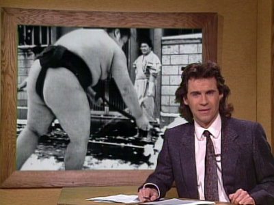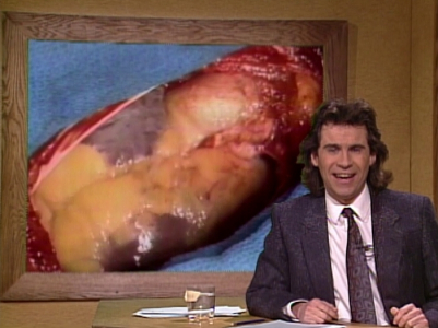 ⁕Kevin Nealon's microphone is off when he delivers his last line.